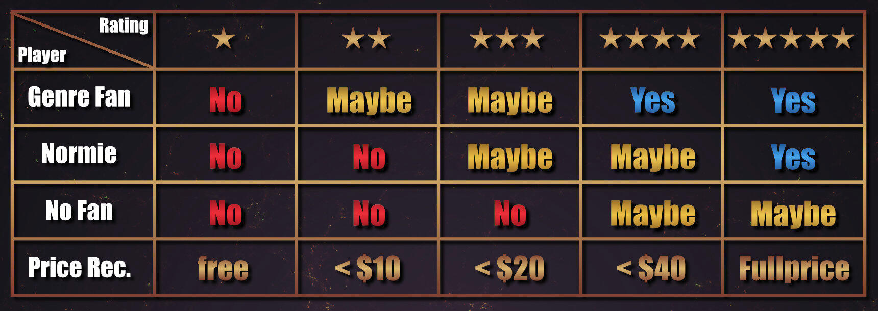 And in the vast space of gaming with thousand upon thousands of games, its important for me to filter games out that i think are probably not worth to play over other better titles.That doesnt mean that a game, i wouldnt outright recommend to you, is necessarily garbage - that place is reserved for the 1-Star games - but i expect most people to not like it enough, to get their moneys worth out of it in consideration of available alternatives.And the reasons for my rating and the issues i've found are of course mentioned in my reviews as well. So its still for you to decide if they might affect your experience as much as mine or not.